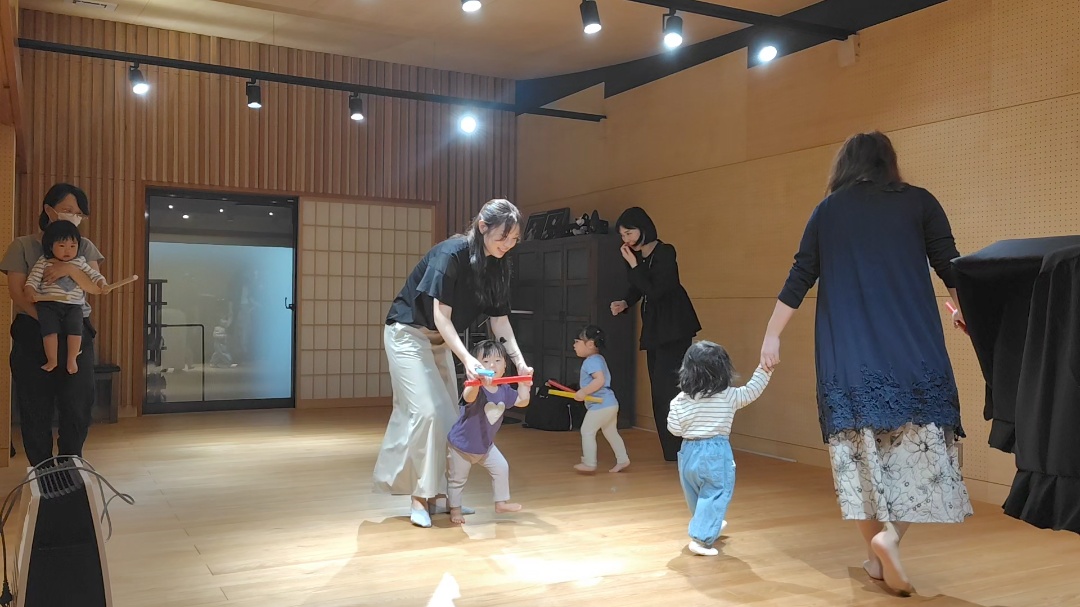 ママと一緒に音楽に合わせて歩いたり、速くなったら走ったり、「歩く」「走る」「止まる」というシンプルな動きからスタート。